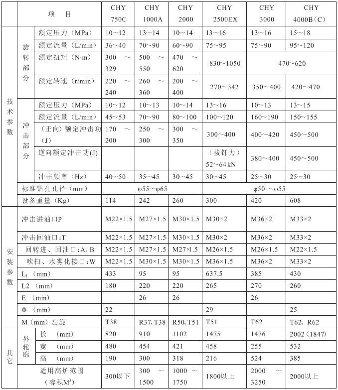 功率大、转速快、消耗低.环保、易操作,能明显降低钻头、钻杆的损耗,降低开口过 程中的粉尘的排放。工作温度范围为-20^-200。;工作介质为阻燃液压油或46#抗磨液压油。设备都具有双向施转,正向冲击功能,部分型号带逆向冲击功能。