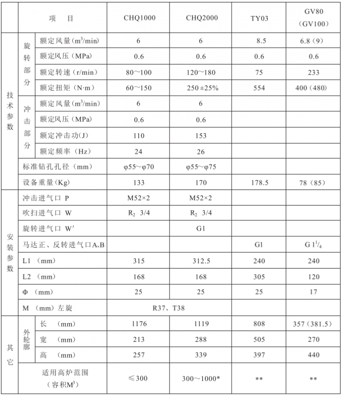 CHQ系列气动开口机结构紧凑、重量轻、消耗低、易操作。工作温度范围为-20P~ 200P;工作介质为压缩空气或氮气;润滑方式为油脂和油雾润滑。主要用于冶金的小型高 炉和残铁开口、也可用于工程、建筑、机械、矿山等。
